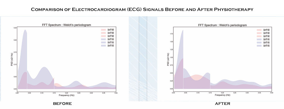 Before physiotherapy, it can be observed that the energy levels of VLF (Very Low Frequency) and HF (High Frequency) are relatively low, indicating that the activities of the sympathetic and parasympathetic nerves are relatively weak or unstable.